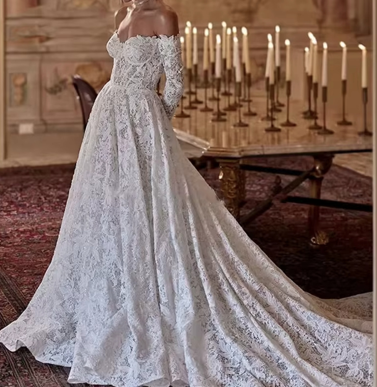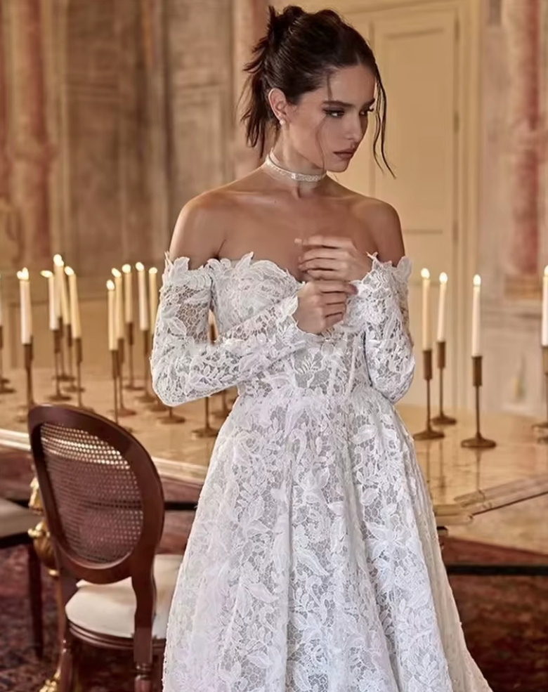 Off-the-shoulder long-sleeved wedding dress Fabienne made of lace and train