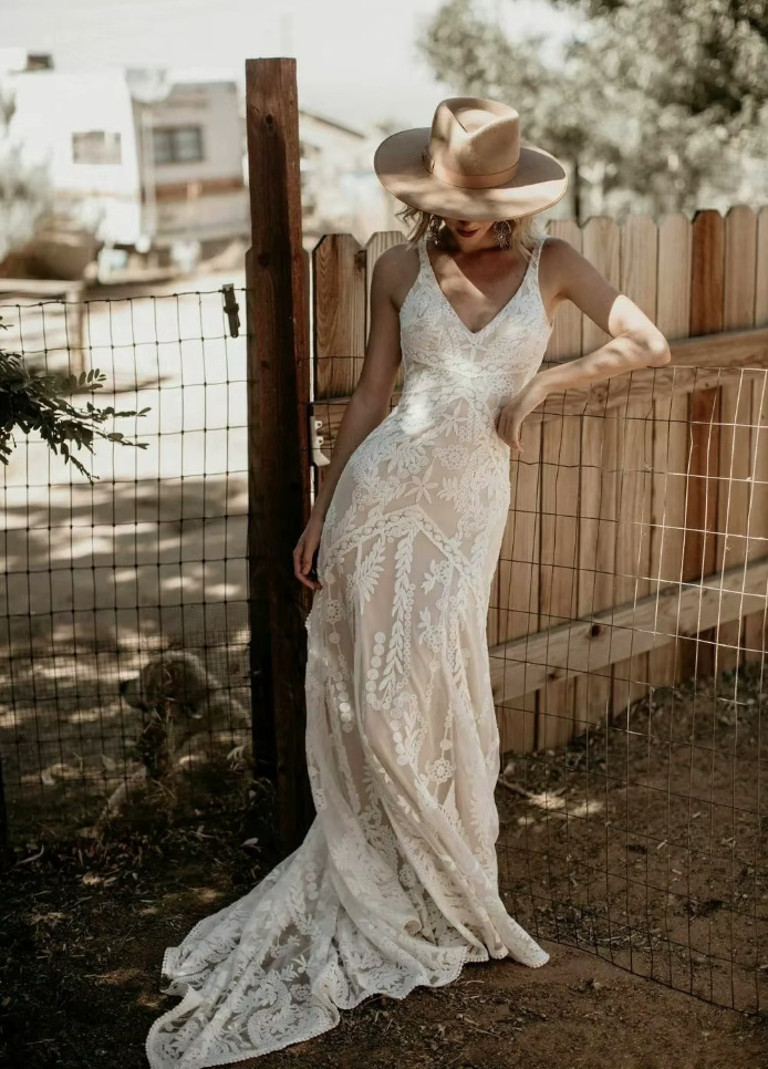 A line boho wedding dress Fiorella made of lace with spaghetti straps