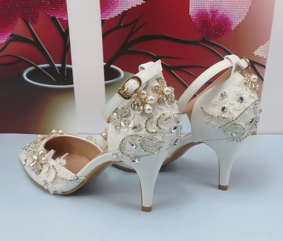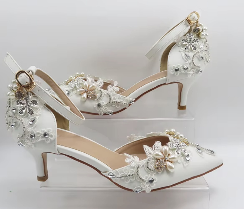 Bridal Pumps Heel Wedding Shoes with Rhinestone Pearls and Ankle Strap