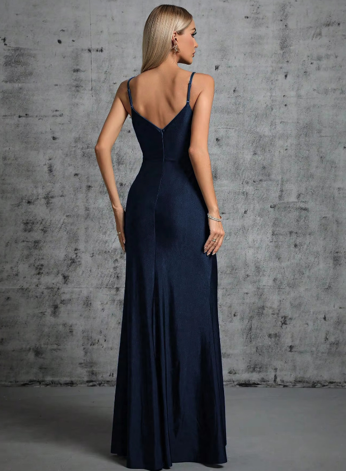 Fit and Flare Dress Elegant for Wedding Guests in Dark Blue with Slit