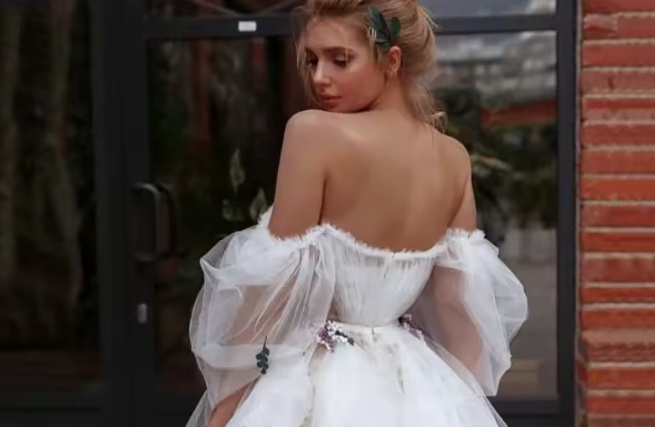 Off-the-shoulder chiffon wedding dress Fay Short with flower appliqués