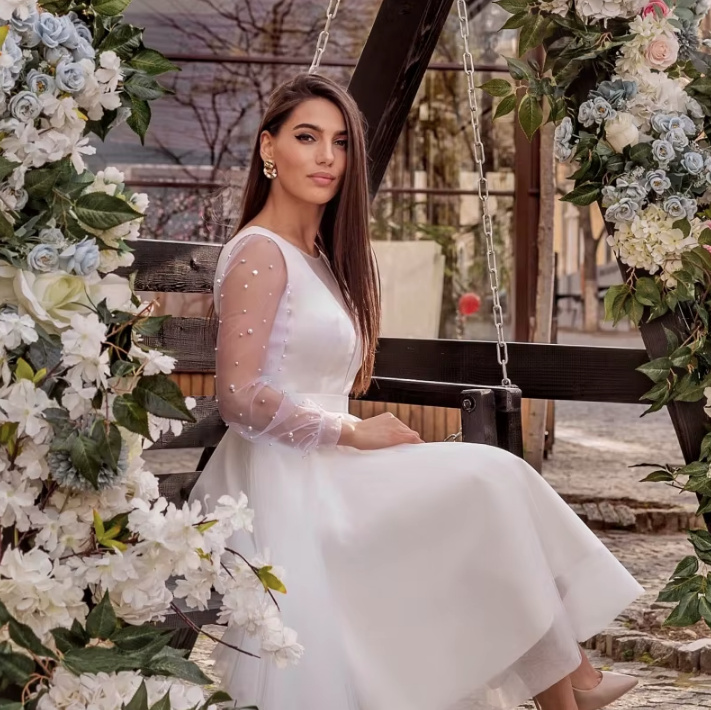 Simple A Line Wedding Dress Femke Knee Length with Tulle Sleeves and Pearl Appliques