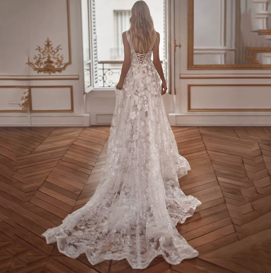 A line wedding dress Fedra made of lace V neck and train