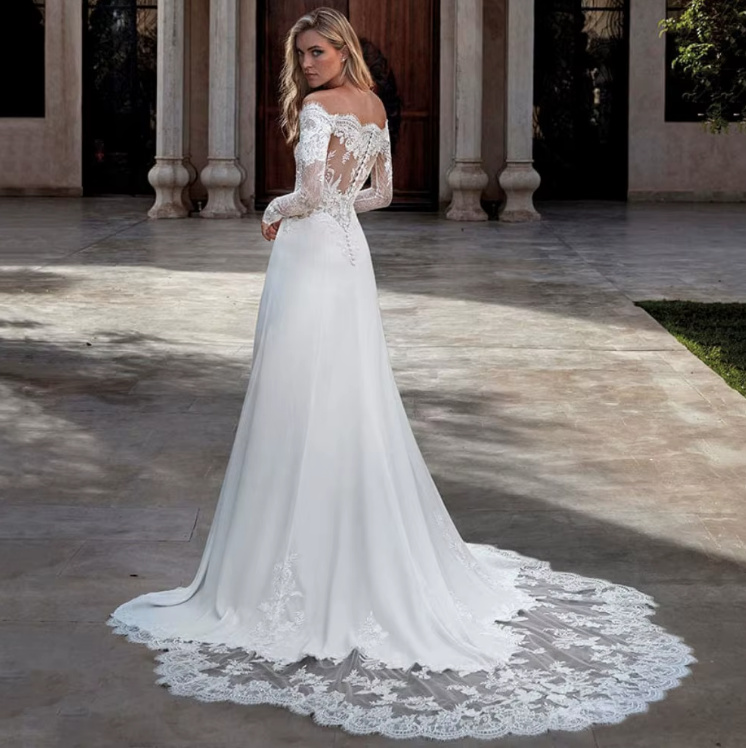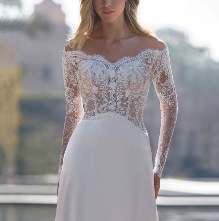 Off-the-shoulder wedding dress Cosima with lingerie top, lace sleeves and train