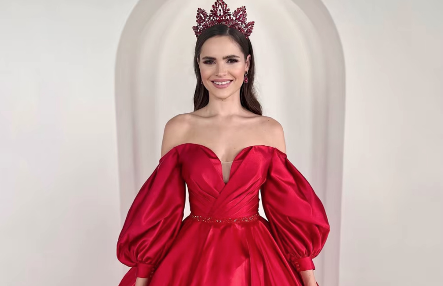 Off-the-shoulder long-sleeved princess wedding dress Caylee with train in red