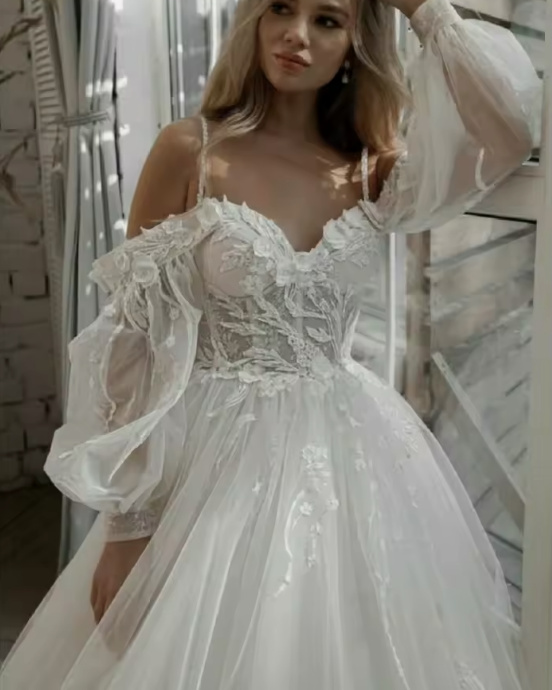 A line wedding dress Faith with lace sleeves, spaghetti straps and train