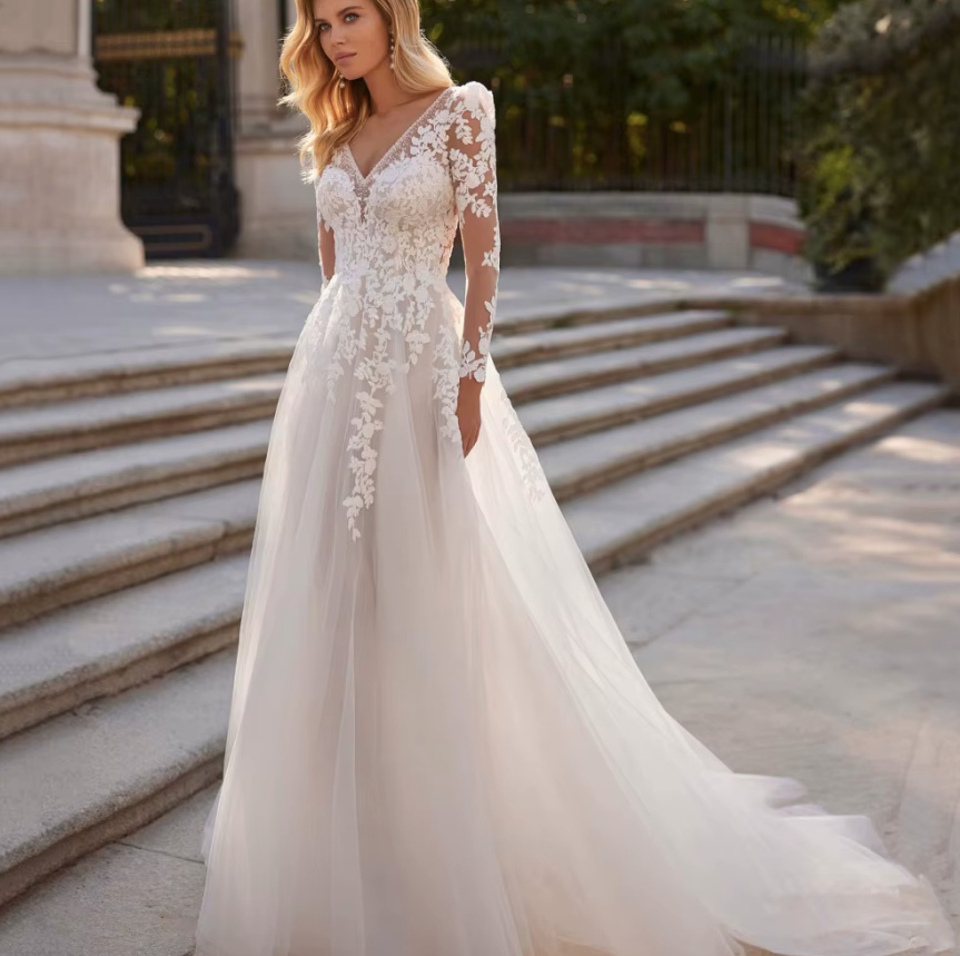 A line wedding dress Fedora with lace sleeves, train and back neckline