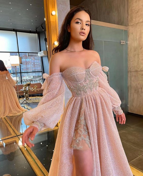 Off-the-shoulder puff sleeve wedding dress Breanna in Champagne High neck