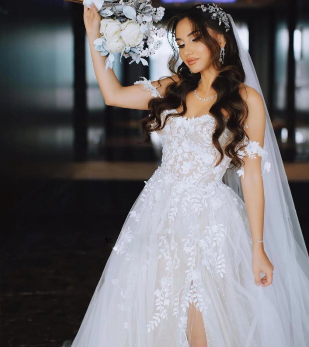 A Line Wedding Dress Bjelle with Sheer Pearls and Lace