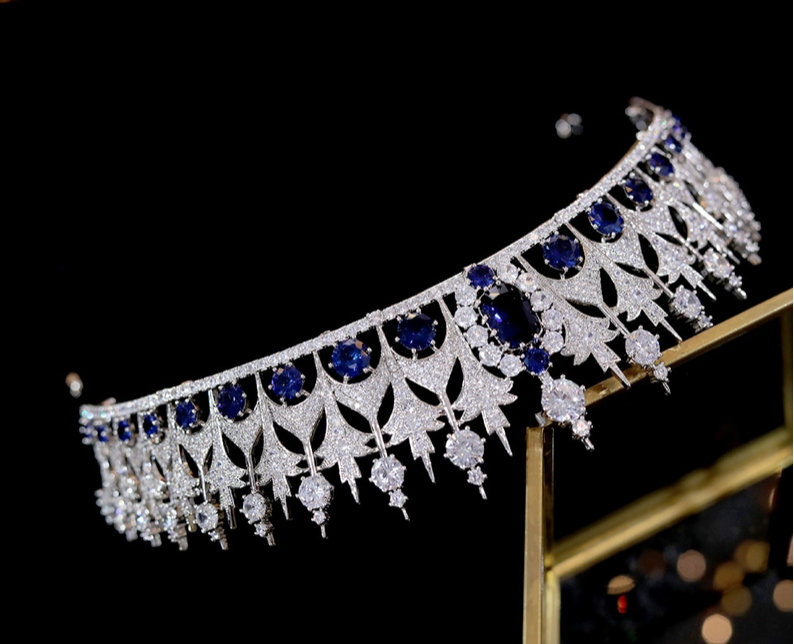 Queen Zirconia Bridal Crown Tiara Bea with Blue Stones