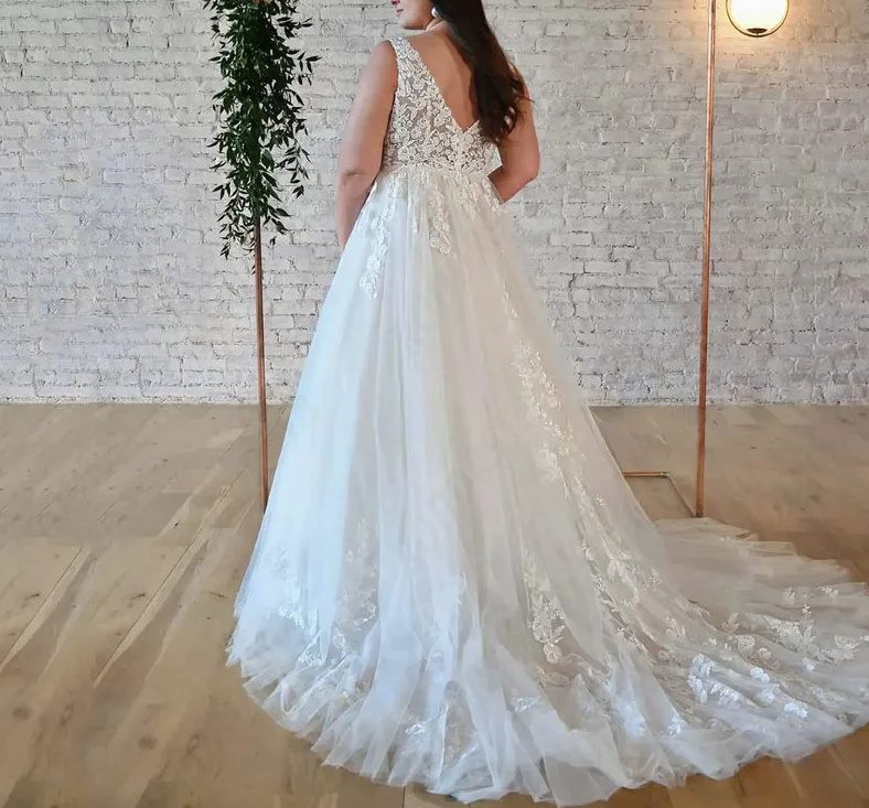 A Line Plus Size Wedding Dress Alisia with V Neck Lace and Train
