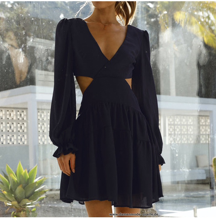 Cut Out V-Ausschnitt Langarm Sommerkleid in Schwarz