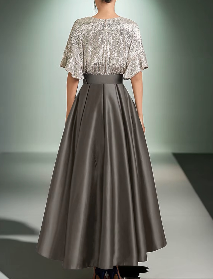 Satin Glitter Dress Christel Elegant for Wedding Guests in Silver Front Short Back Long