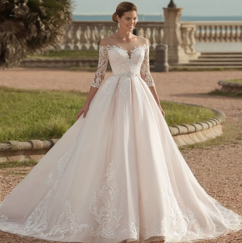 Classic satin wedding dress Ayla with illusion neckline and tattoo lace