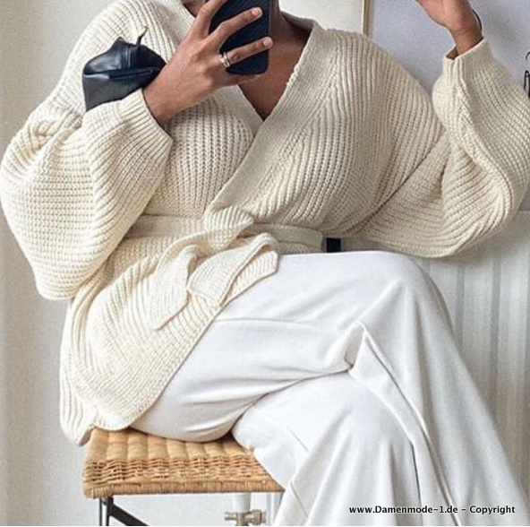 Damen Baumwoll Cardigan Strickjacke zum Binden Beige Creme