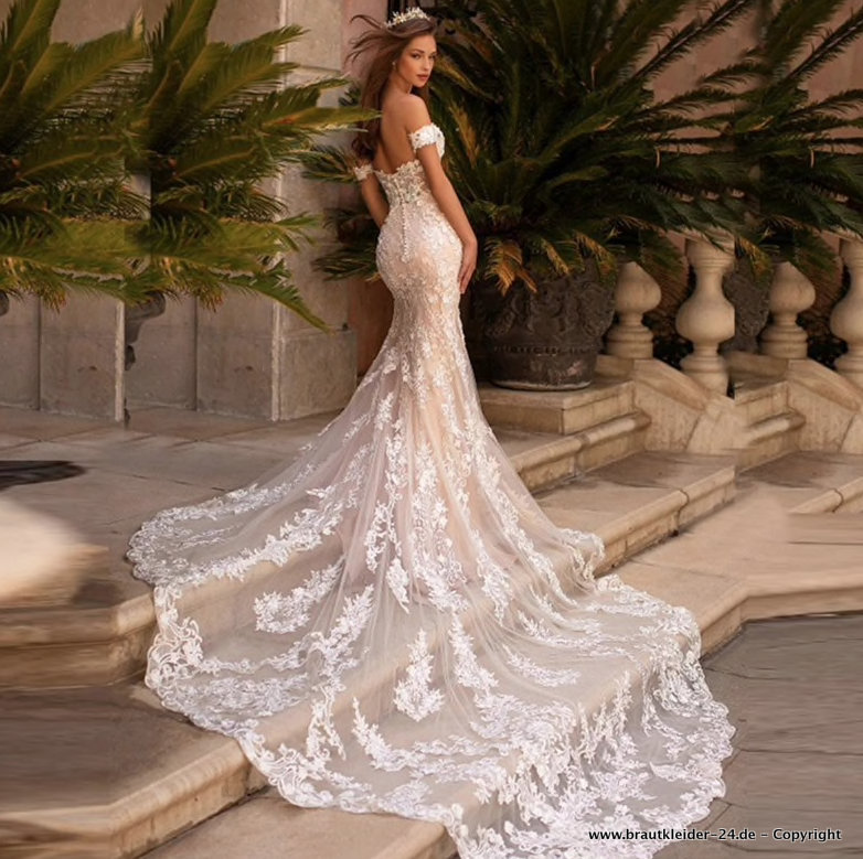 Sexy Meerjungfrau Spitzen Brautkleid Schulterfrei Elaine mit Spitze und Schleppe