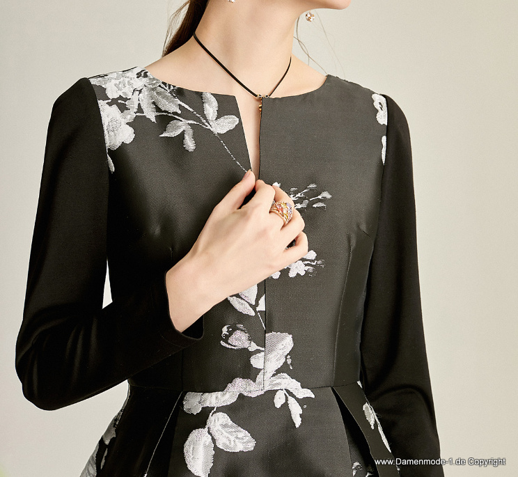 Elegantes Langarm Jacquard Kleid in Schwarz mit Blumen Wadenlang