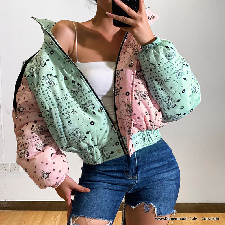 Damen Winter Jacke Kurz in Rosa Grün mit Muster