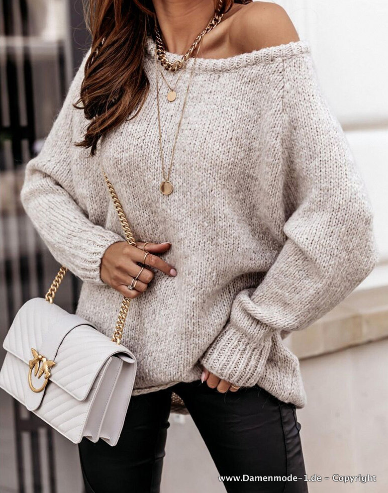 Langarm Winter Strickpullover mit Rundhals Ausschnitt Creme Elfenbein