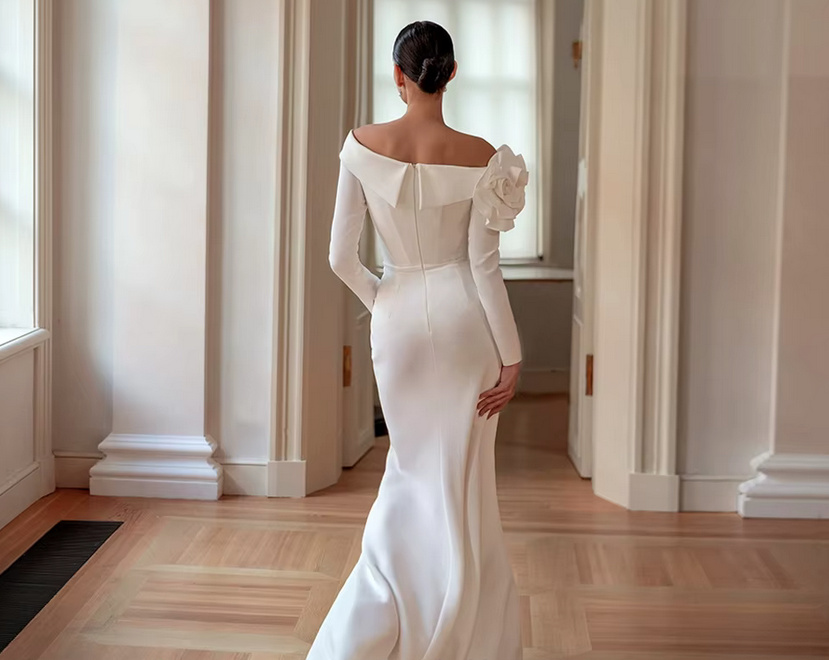 Long sleeve I line wedding dress Cate with brush train and flower