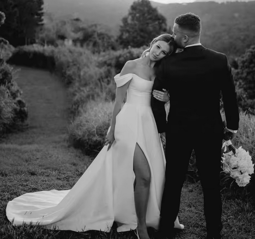 Off-the-shoulder A-line Clean Chic wedding dress Freimuth with sexy slit and train
