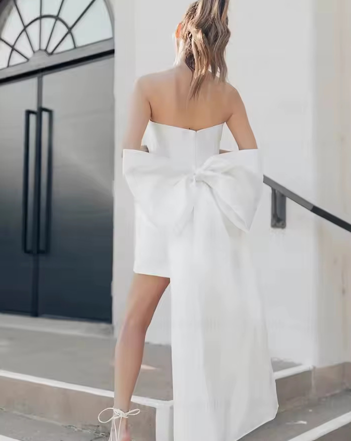 Shoulder-free mini wedding dress Friederike with large bow