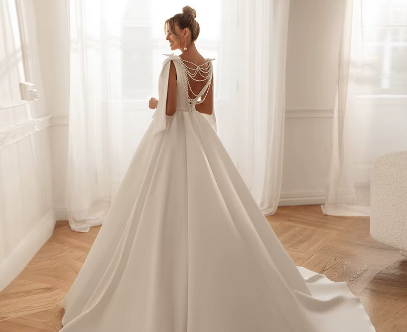 A Line Satin Wedding Dress 2025 Felize with Train and Pearl Appliques
