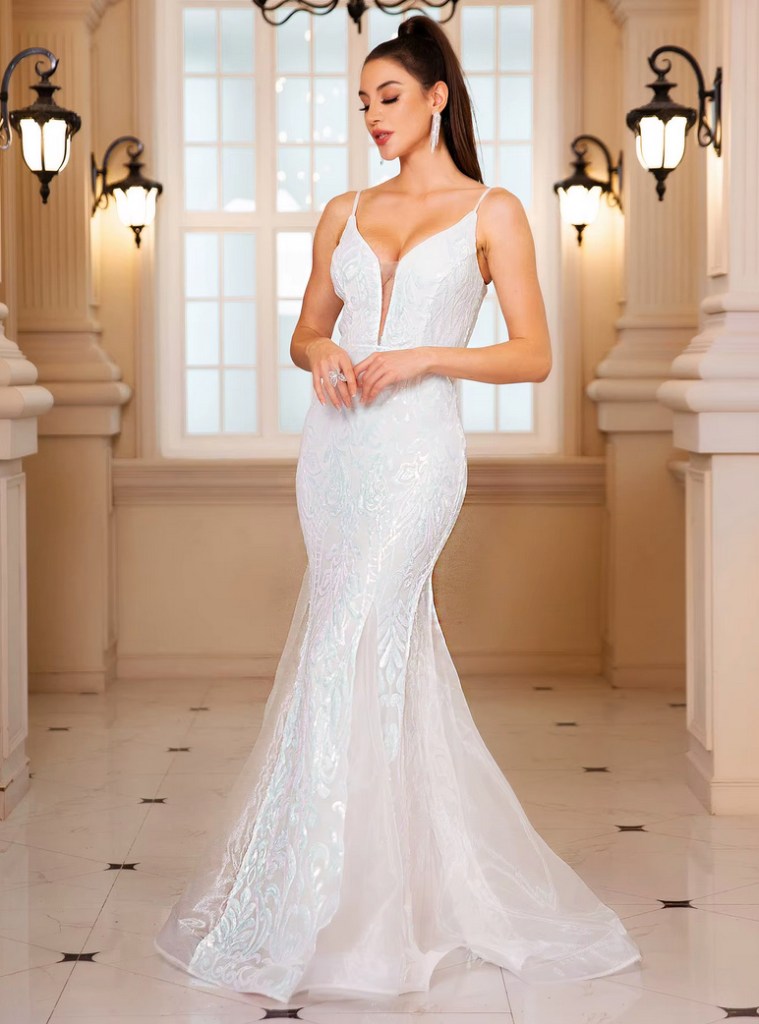 Mermaid wedding dress 2025 with spaghetti straps and flower appliqués
