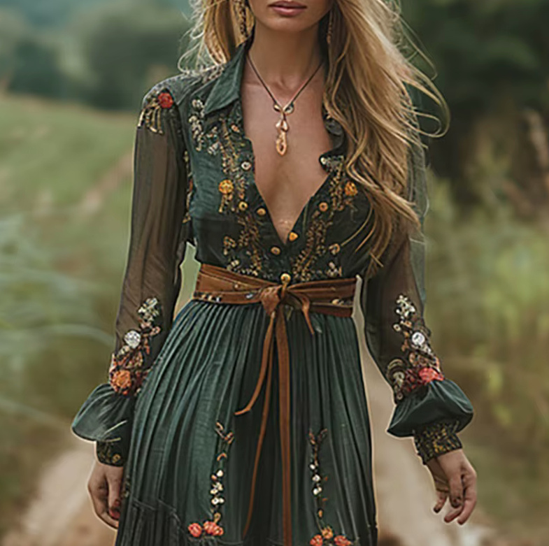 Boho Style Langarm Sommerkleid 2025 Delinda in Grün mit Blumen Stickereien