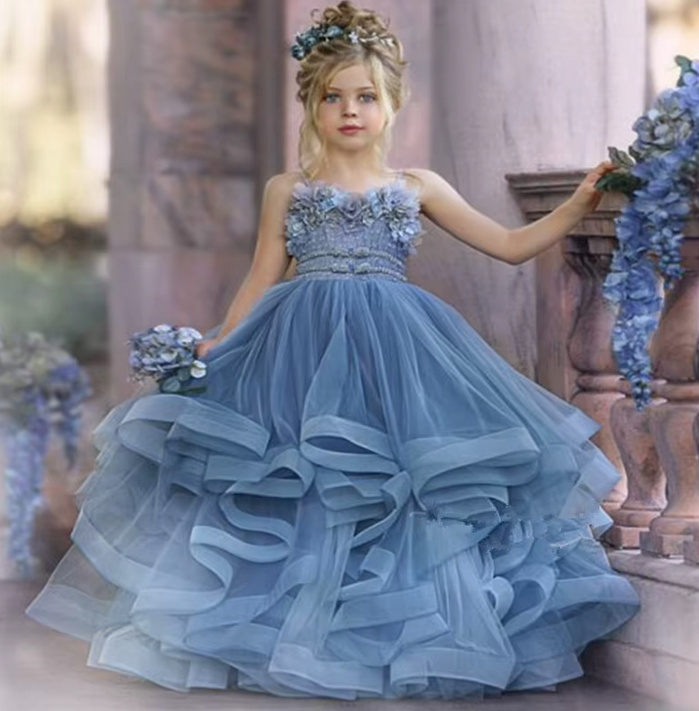 A Line Flower Girl Dress Danica with Spaghetti Straps Flowers and Tulle Blue