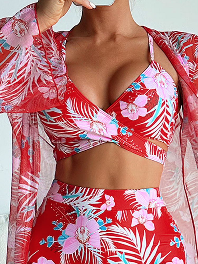 Sommer 2025 Triangle Blumenmuster Bikini Set Traude Dreiteilig Rot