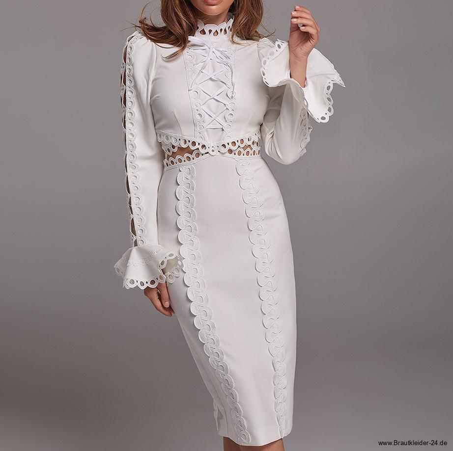 Elegantes Vintage Langarm Midi Bodycon Standesamtkleid für die Braut in Weiß