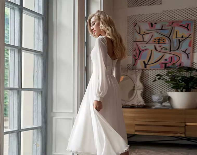 Long Sleeve Chiffon Registry Office Wedding Dress Geertje Calf Length