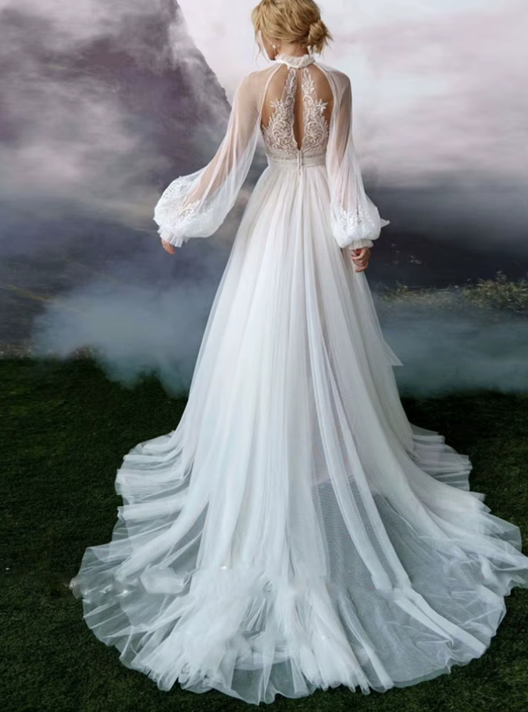 A line boho wedding dress Gemma with lace tulle sleeves and back neckline
