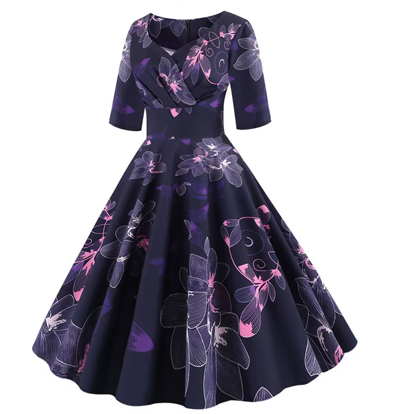 A Line Vintage Rockabilly Dress 2025 Davinia Knee Length Purple with Flowers