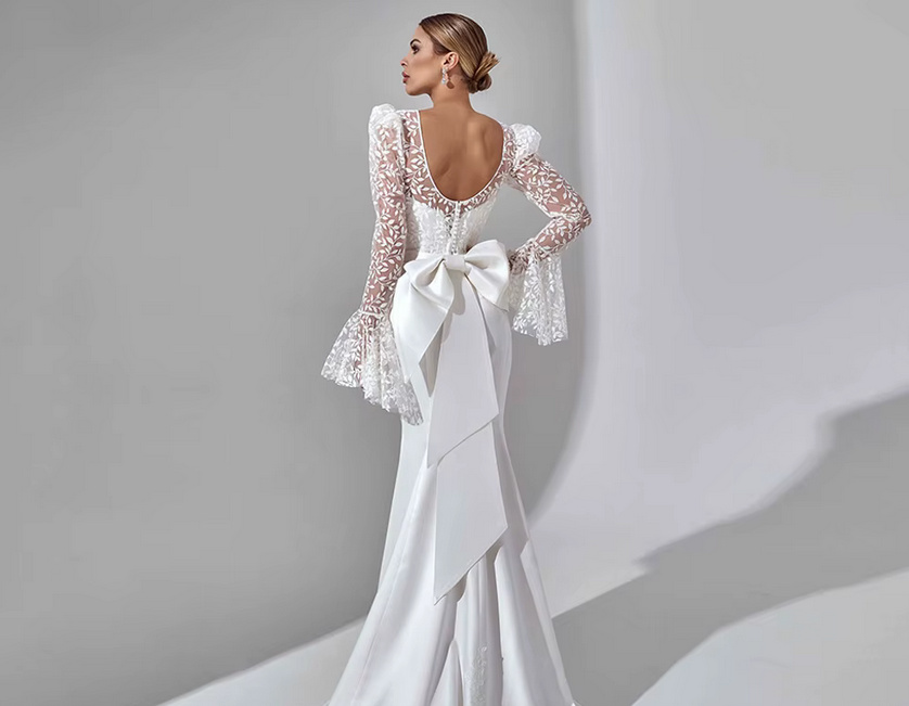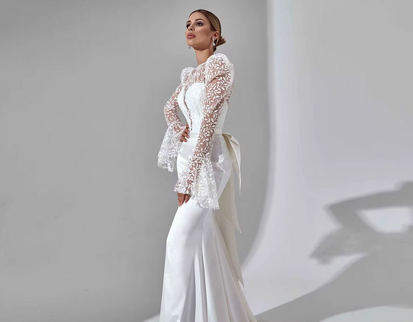 Fit and Flare Satin Brautkleid Gilliane mit Ärmeln aus Spitze und Rückenausschnitt