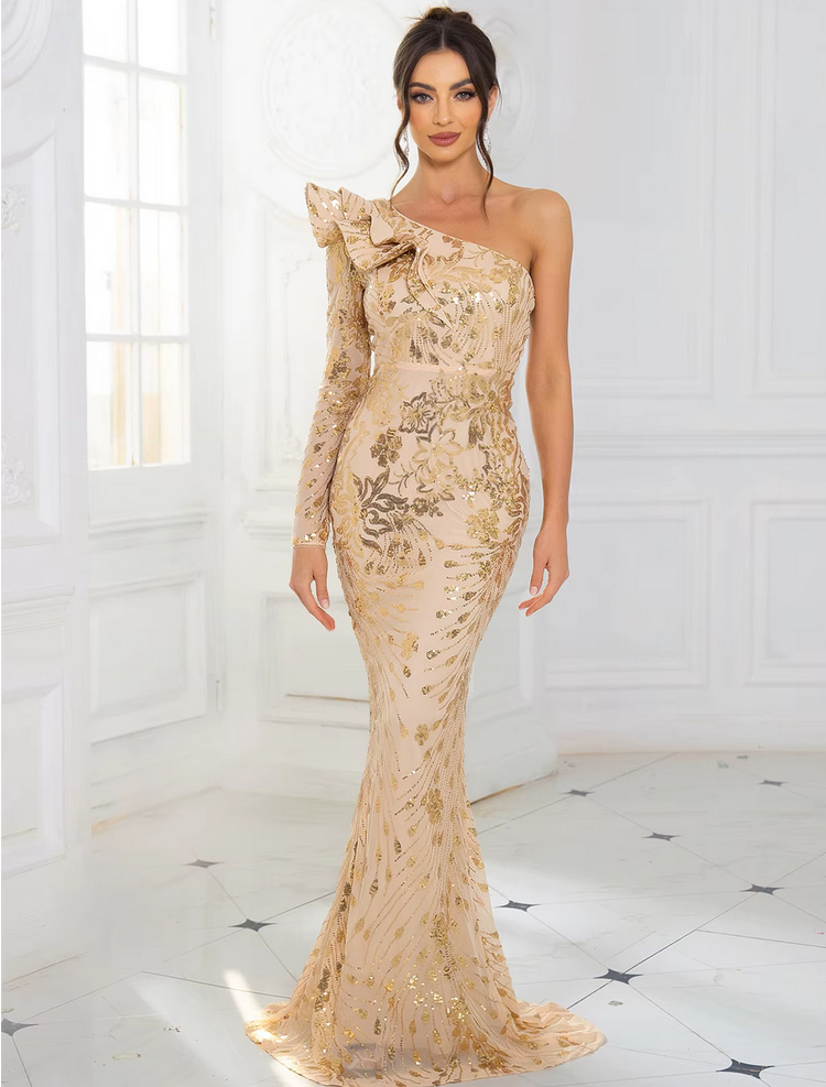 One Shoulder Fit and Flare Civil Wedding Dress Champagne with Floral Appliques