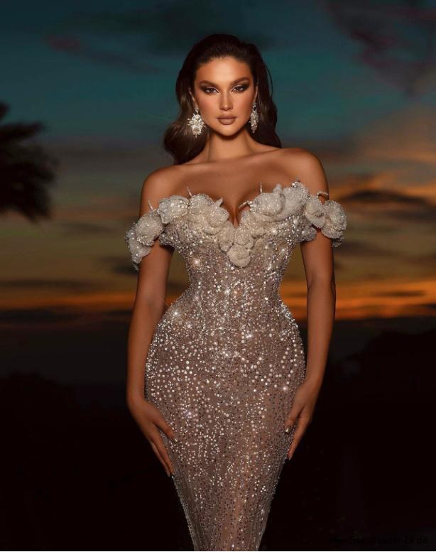 Exquisite Kristall Meerjungfrau Brautkleid Schulterfrei mit Schleppe und Blumen