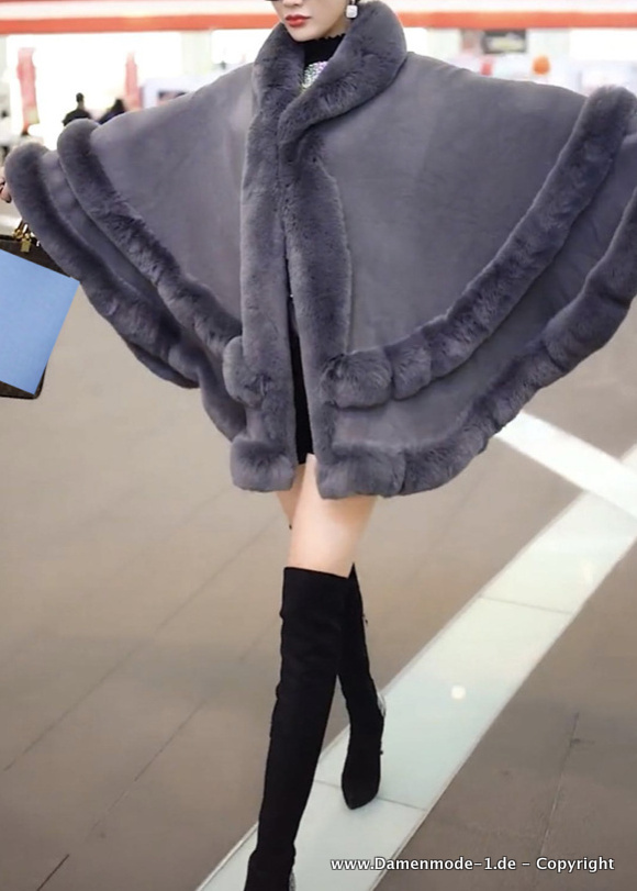 Luxus Kunstpelz Damen Poncho mit Kapuze Elegant in Silbergrau