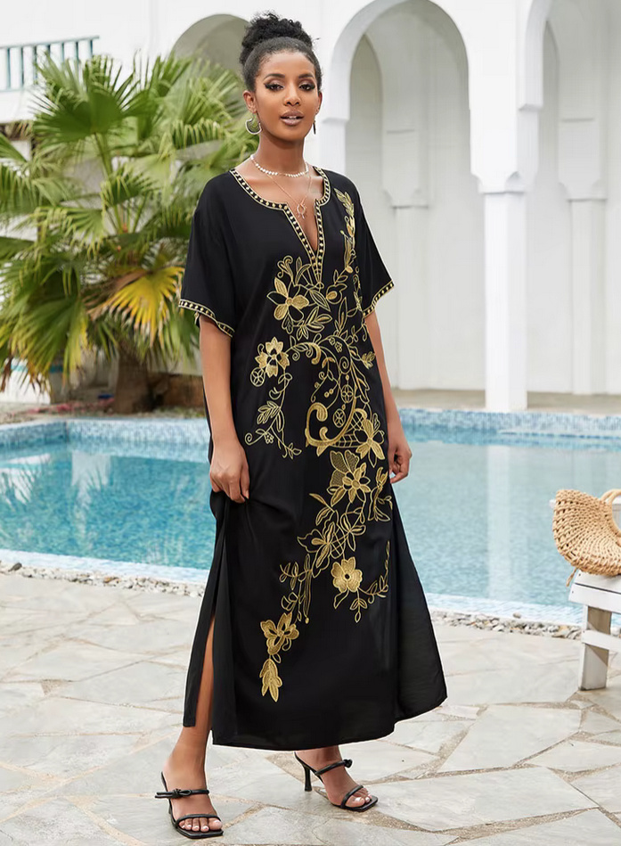 A line kimono style beach dress 2025 cover up dress Tuala black with flowers