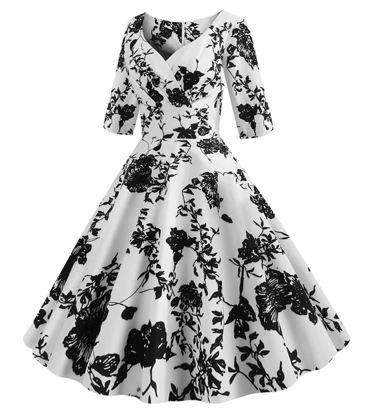 A Line Vintage Rockabilly Dress 2025 Davinia Knee Length Black White with Flowers