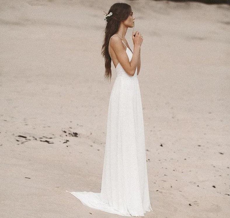 Spaghetti strap beach style wedding dress Andy with brush train