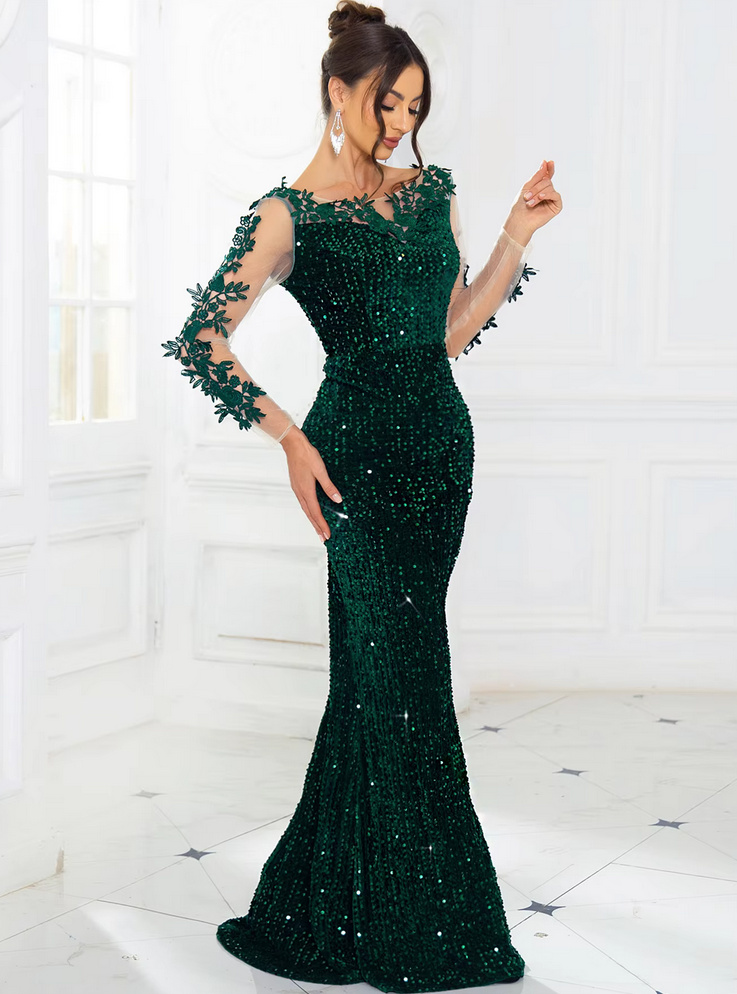 Mermaid glitter evening dress 2025 in green with lace sleeves