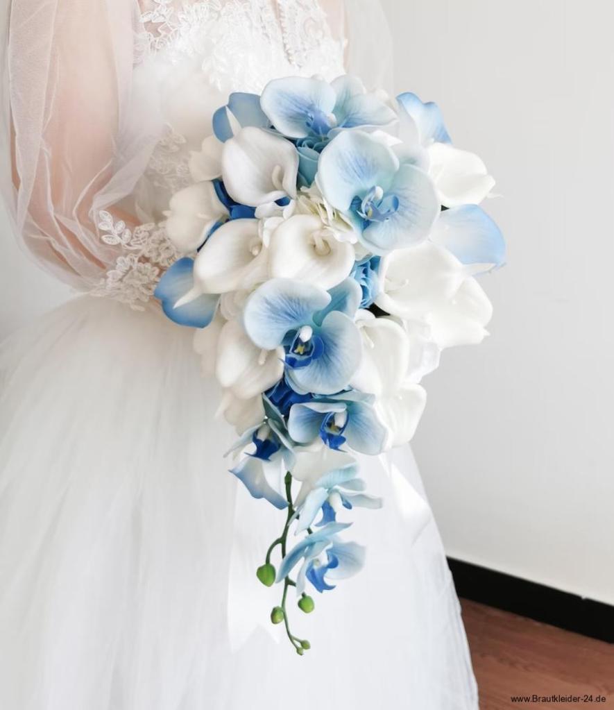 Hochzeit Bouquet Brautstrauß Hellrun mit Cala und Orchideen Blau Weiß