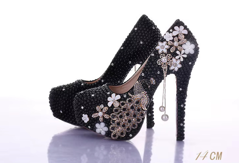 Bridal crystal high heels wedding shoes with pearls black up to size 43