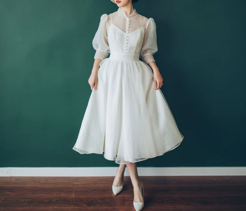 Vintage Style A Line Civil Wedding Dress Gritt Calf Length White