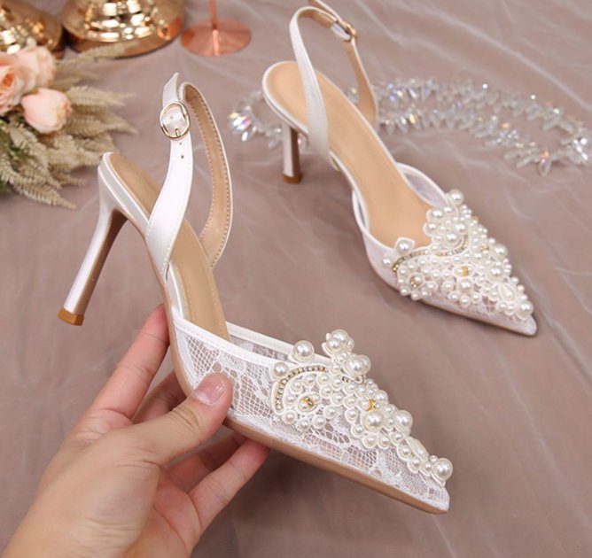 Braut Sandaletten Hochzeitsschuhe mit Perlen Applikationen Spitz