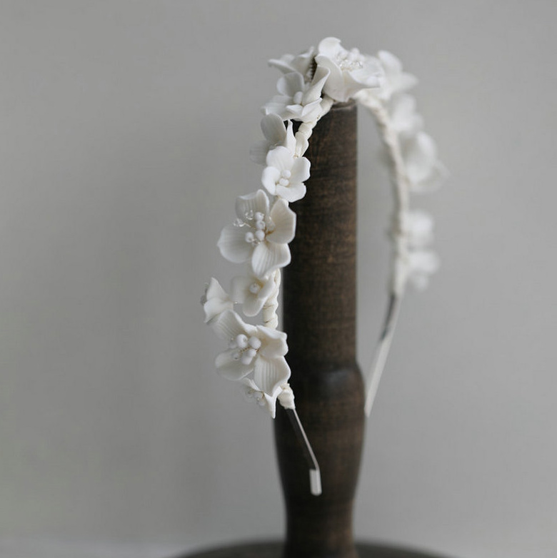 Braut Haarband Elegant in Weiß mit Porzellan Blumen