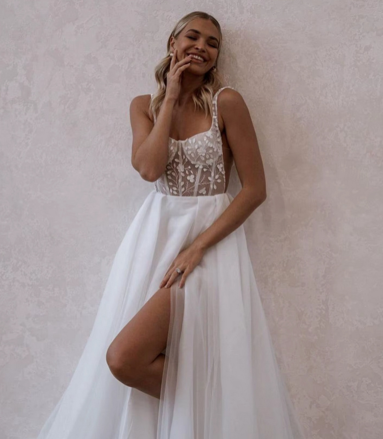 A line chiffon wedding dress Glenn with lingerie top and slit