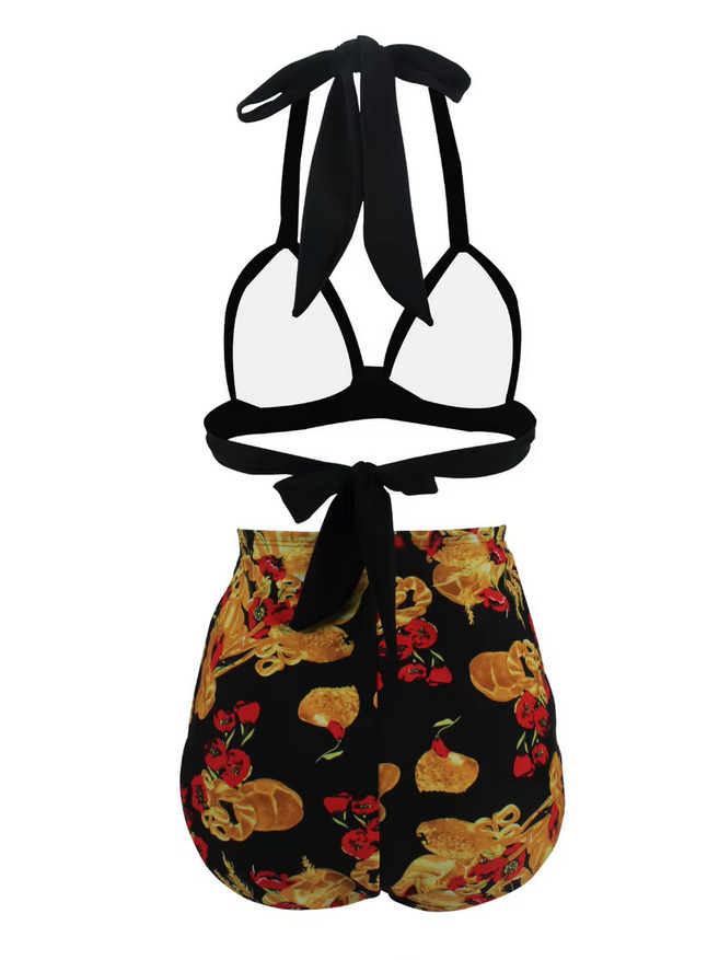Pin Up Style Halterneck Bikini 2025 Tula Plissiert in Schwarz mit Blumenmuster